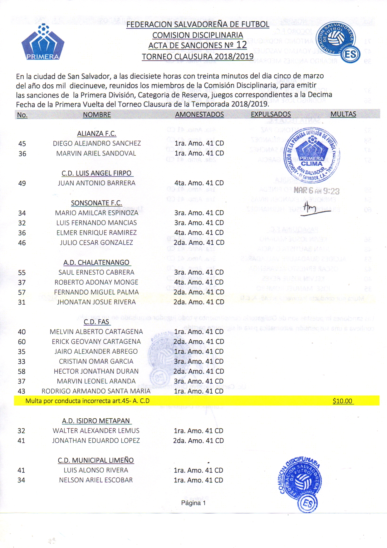 La Primera División de Fútbol recibió por parte de la Comisión Disciplinaria FESFUT, acta de sanciones correspondientes a la Jornada 10 del Clausura 2019. En el circuito de privilegio serán 4 jugadores los que no verán actividad este fin de semana, por otro lado, en la Reservas solamente un jugador está suspendido.