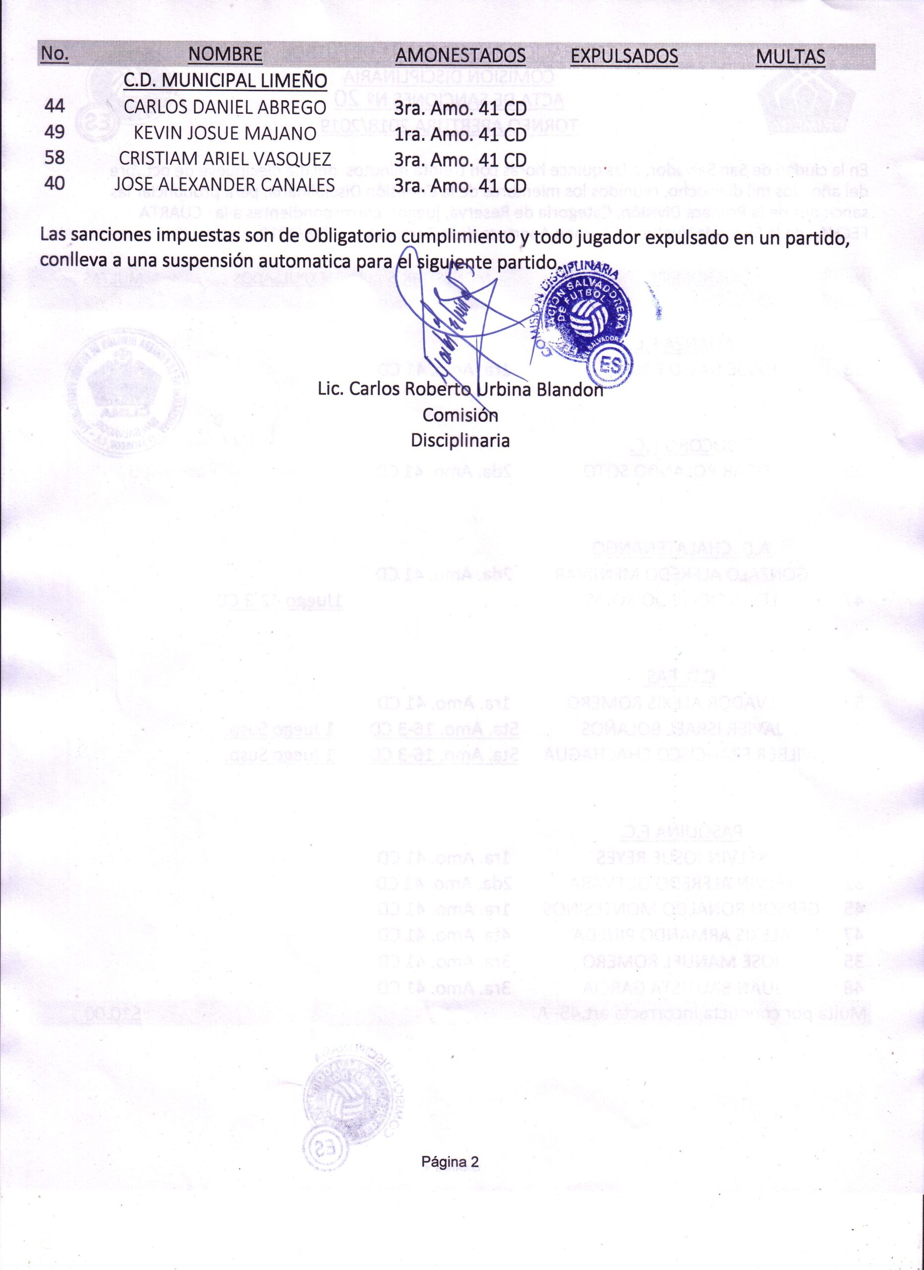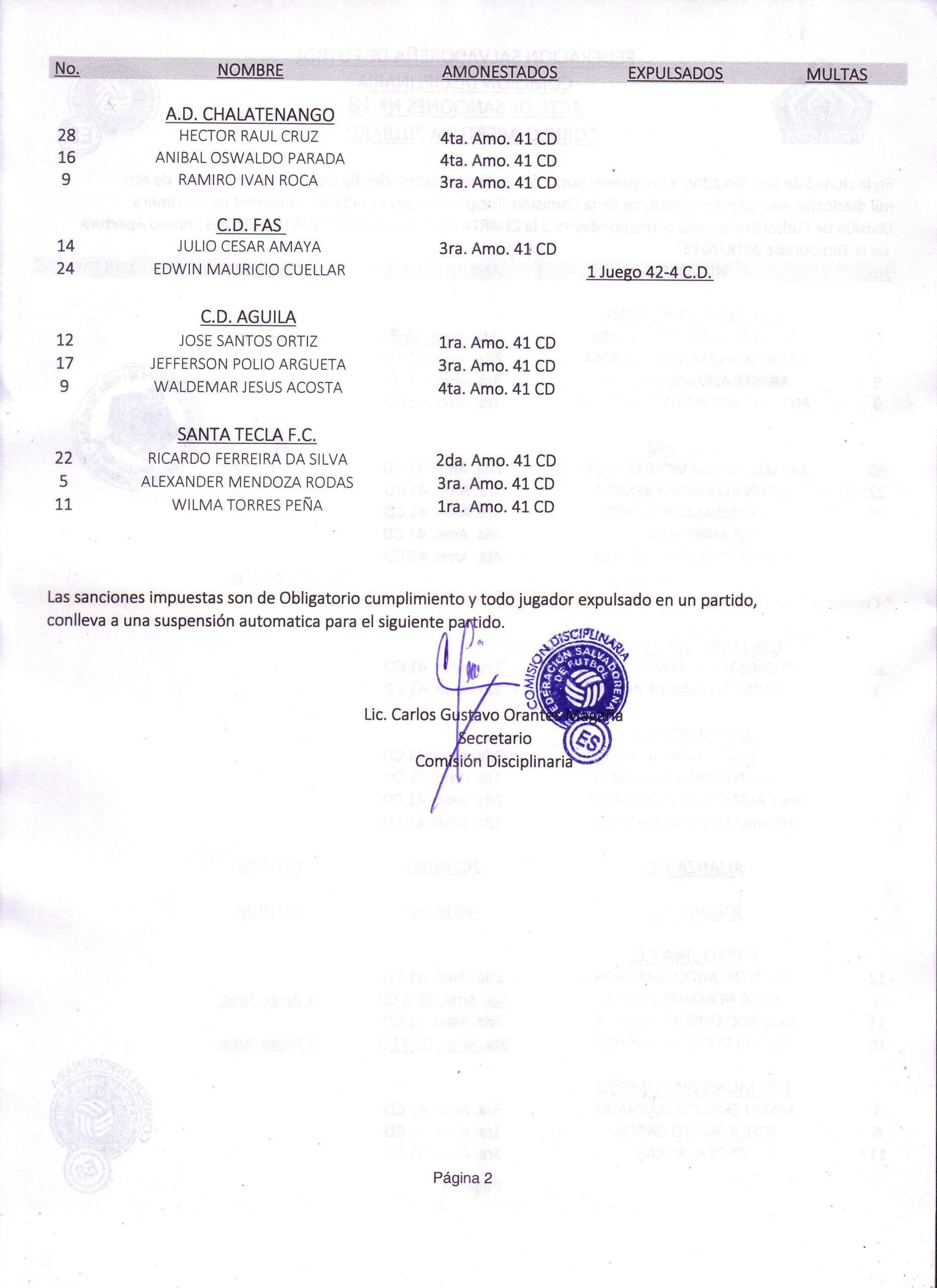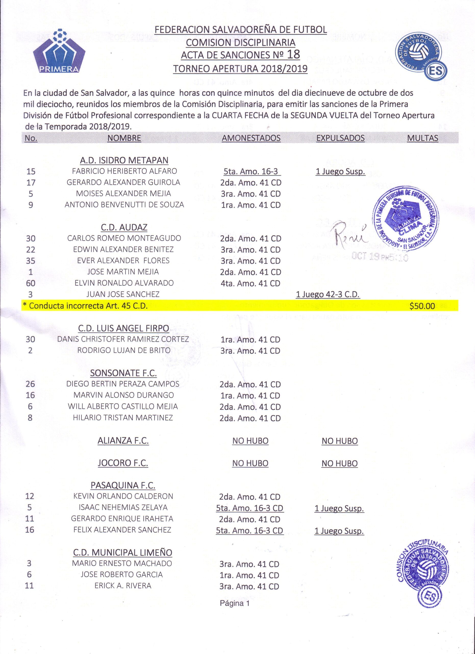 La Comisión Disciplinaria Disciplinaria de la Federación Salvadoreña de Fútbol (FESFUT) dio a conocer las sanciones impuestas en la Jornada 15, Liga Pespi Apertura 2018, tanto en Cat. Mayor como Reservas.