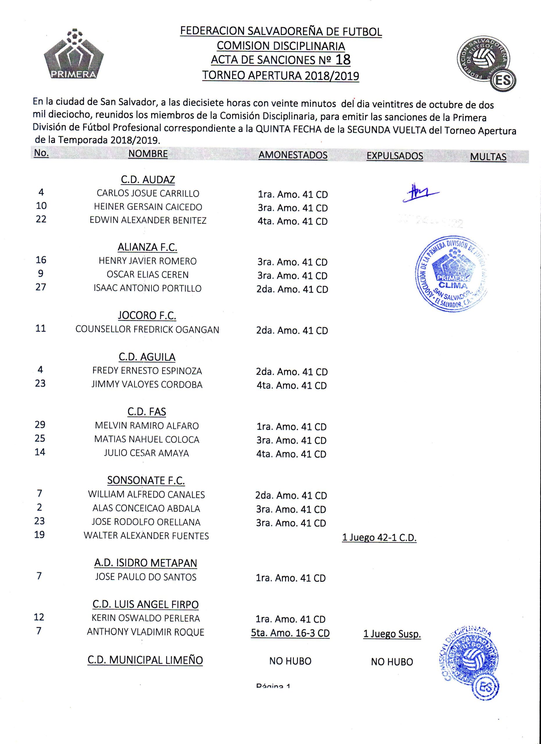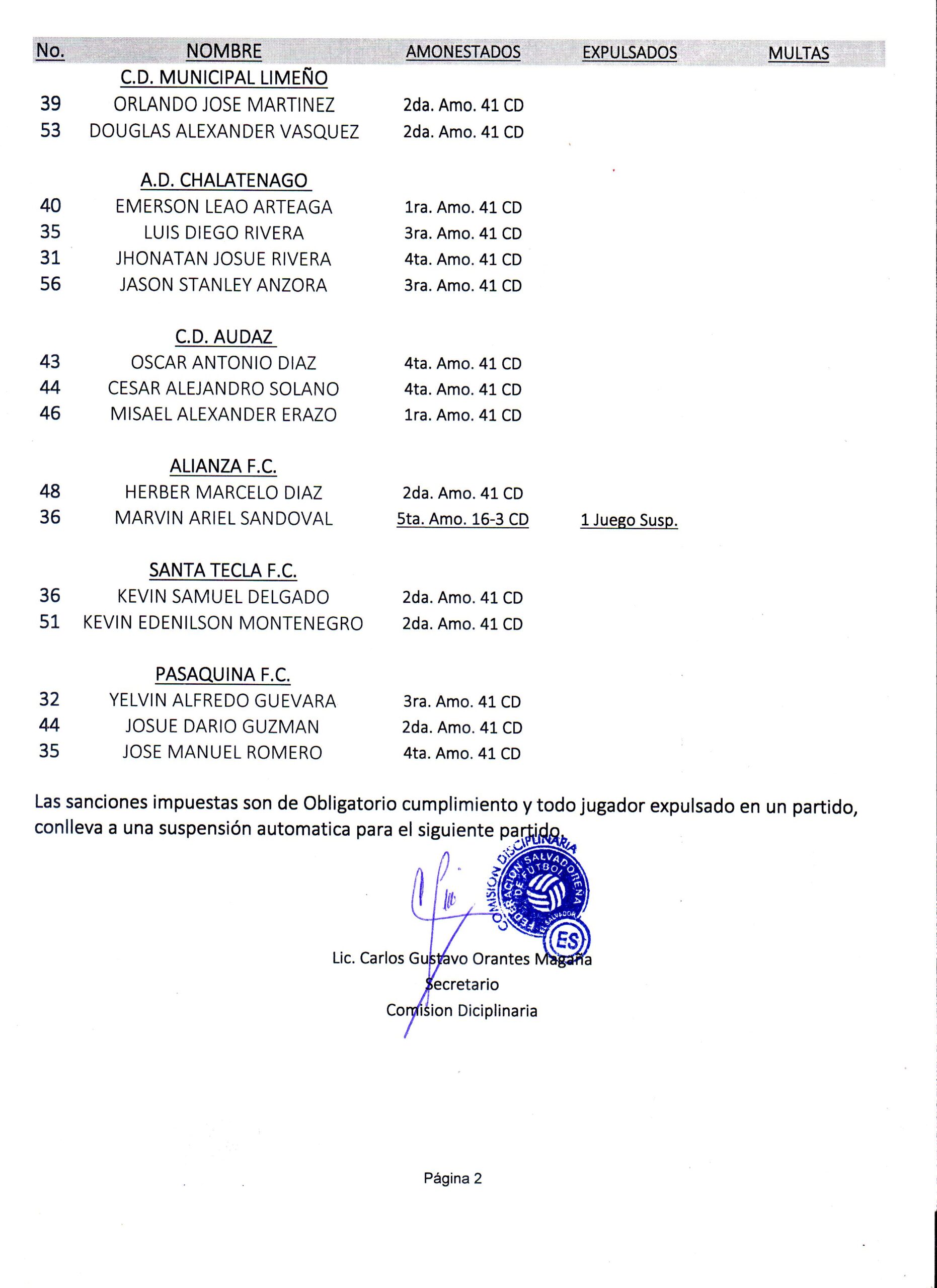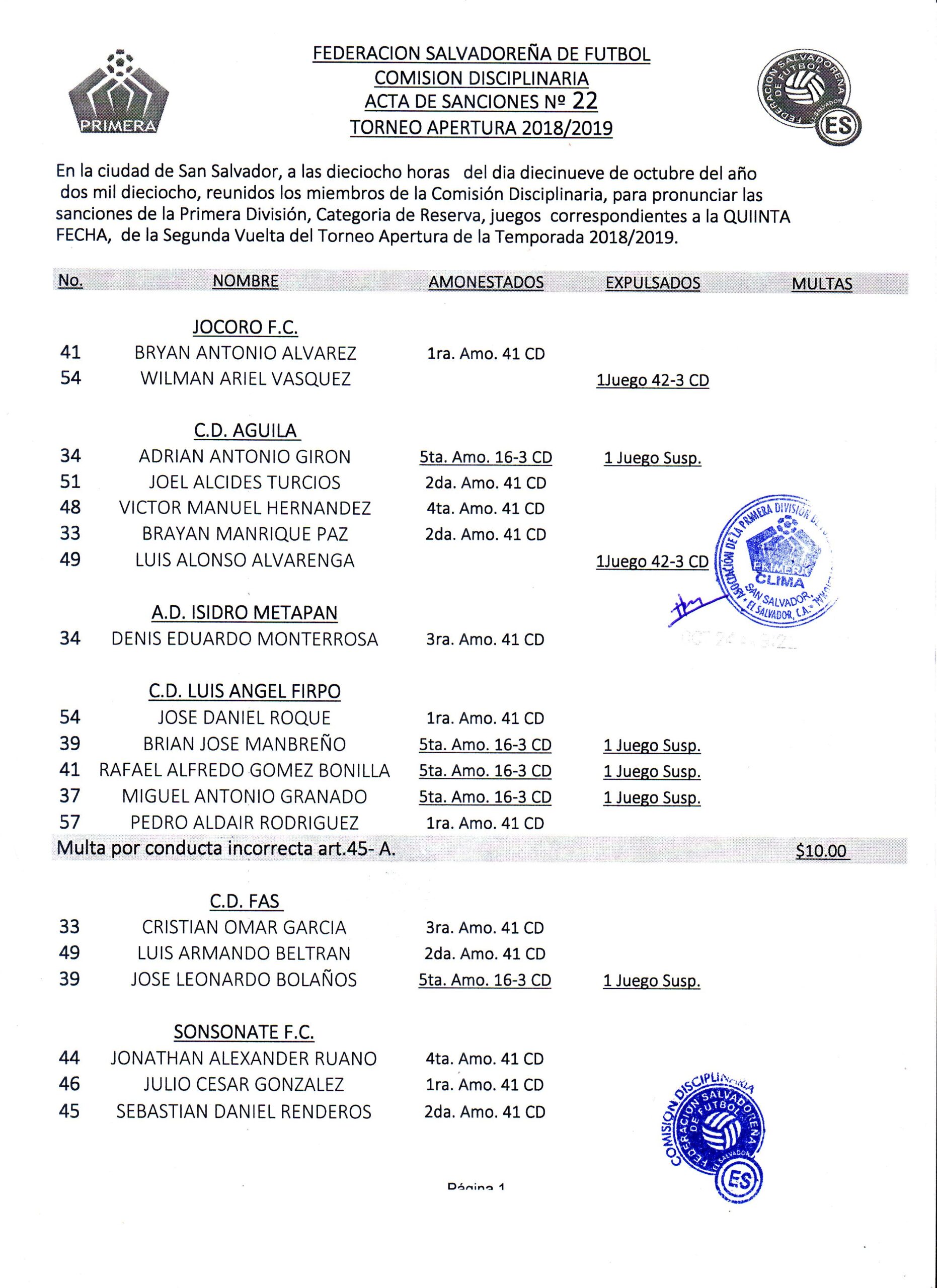 La Comisión de Disciplinaria de FESFUT comunicó las actas de sanciones correspondientes a los juegos realizados este fin de semana (Jornada 16). En la Cat. Mayor 28 jugadores recibieron amonestación. Walter Alexander Fuentes (Sonsonate FC) e Ismael Antonio Valladares (AD Chalatenango) fueron expulsados y suspendidos, mientras que Anthony Vladimir Roque (CD L.A. Firpo) y Kevin Oswaldo Santamaría (Santa Tecla FC) no tendrán participación durante un encuentro por acumulación de amarrillas.