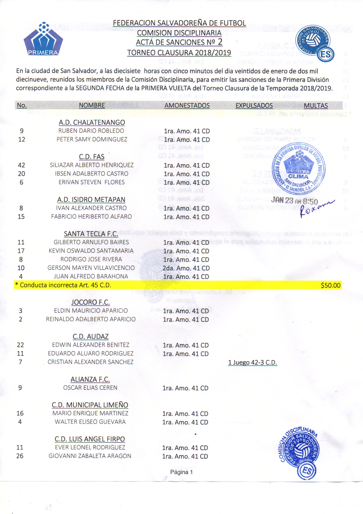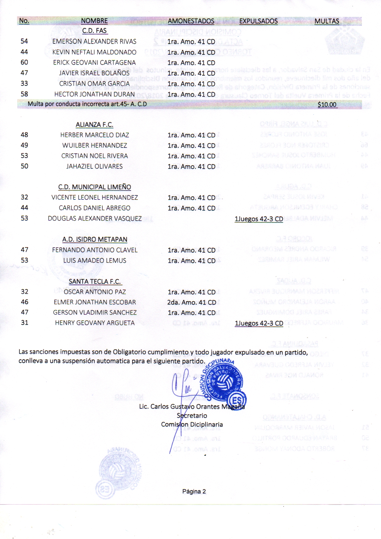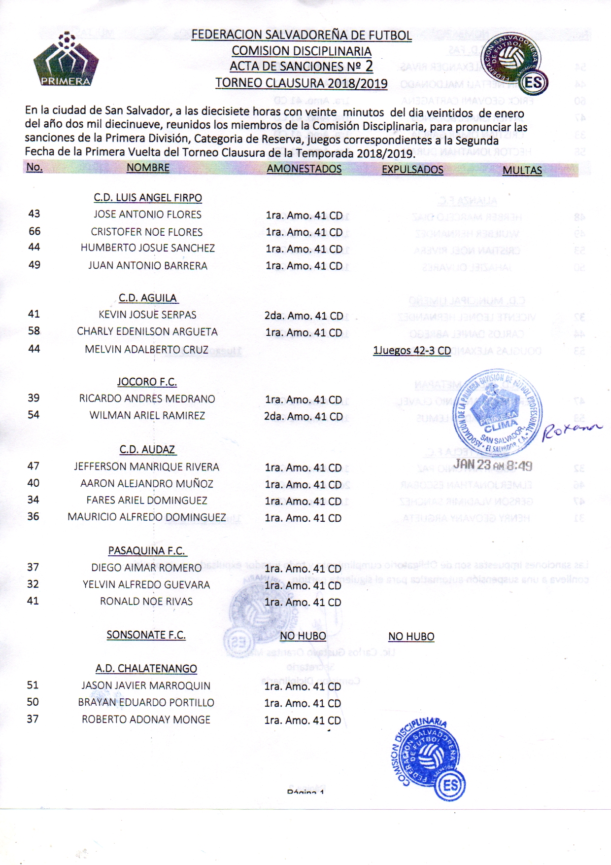 La segunda fecha de la Liga Pepsi dejó como resultado 74 sanciones impuestas tanto en el circuito de privilegio como en el reservista, la Comisión Disciplinaria brindó el informe de sanciones en la cual detalla, respecto al torneo mayor, 34 amonestaciones y dos expulsiones, impuestas a Cristian Sánchez y Ronald Daniel Rodríguez de CD Audaz y CD Águila, respectivamente. A continuación se detallan las actas sancionatorias: