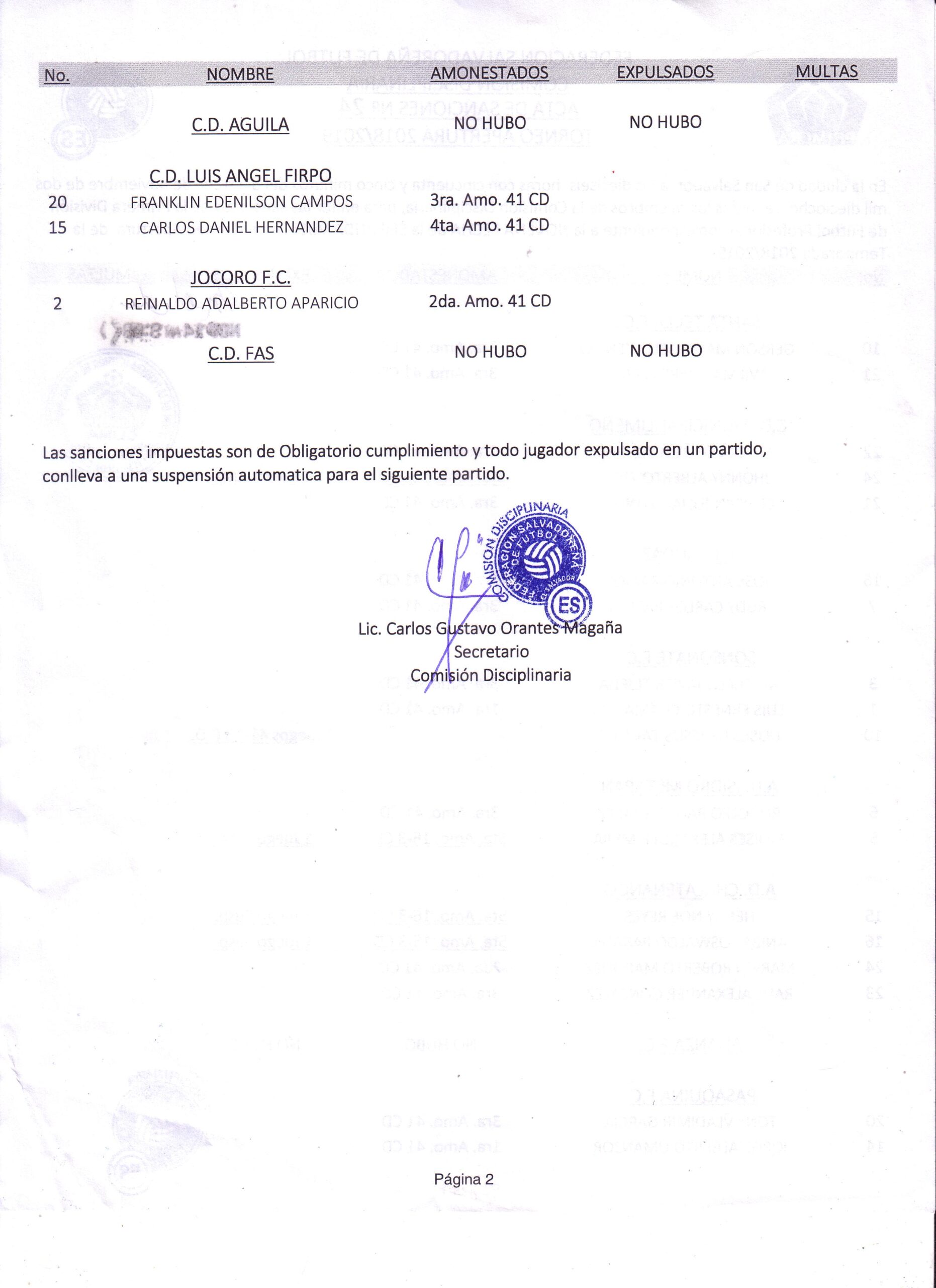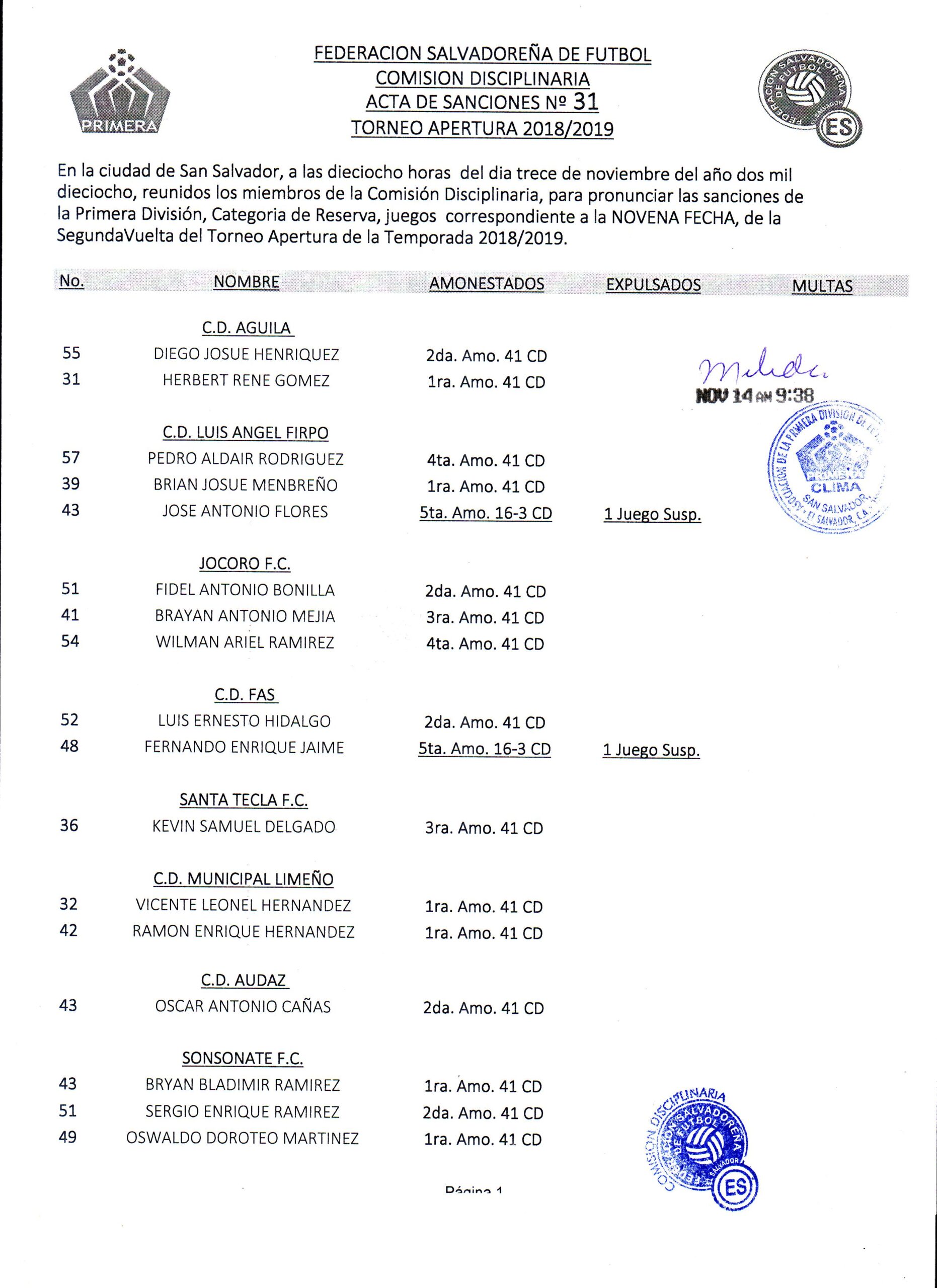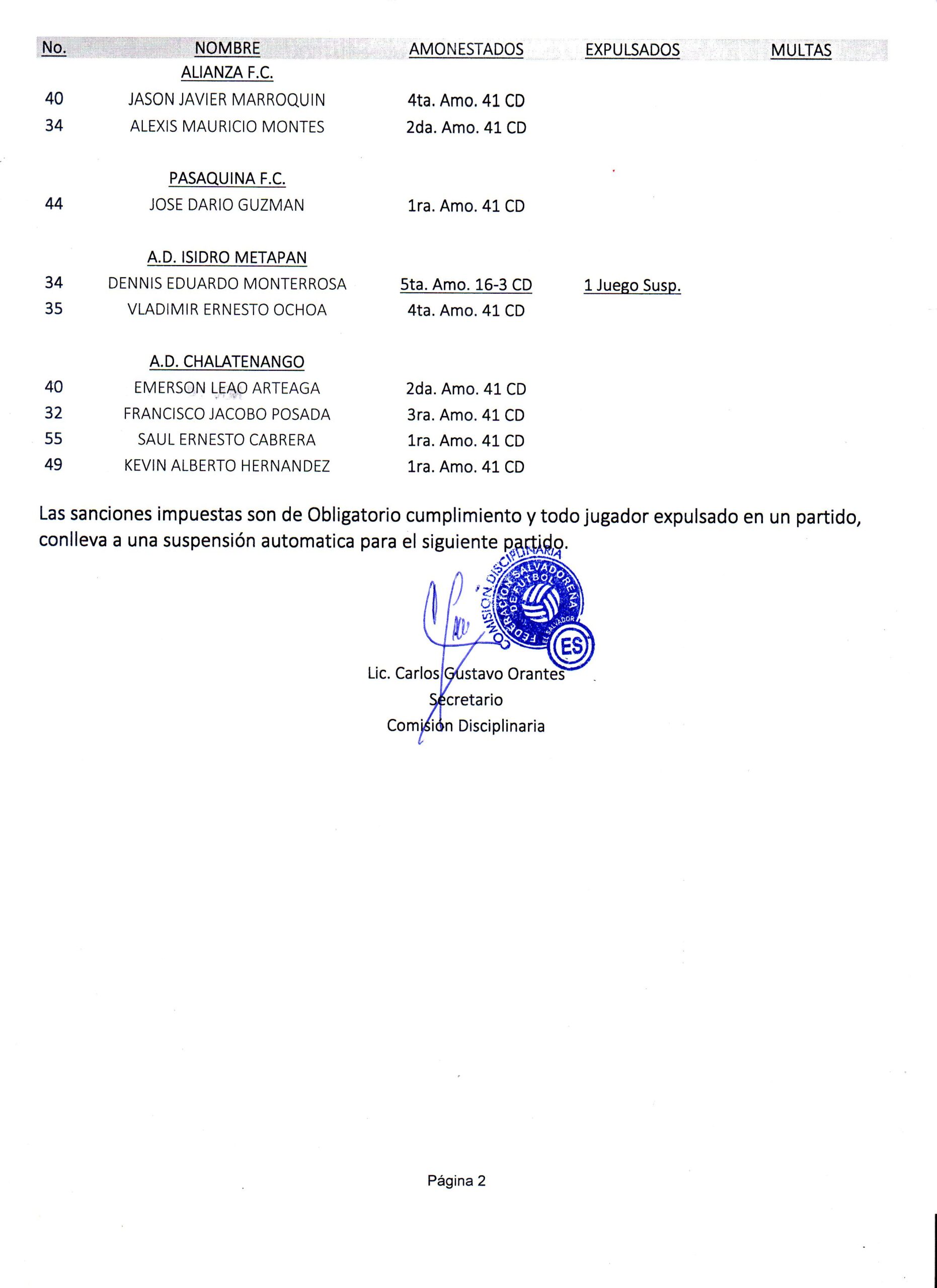 La Comisión Disciplinaria del ente recto del fútbol nacional, notificó detalles de los jugadores sancionados en Cat. Mayor y Reservas, correspondientes a la Jornada 20. La nomina destaca 5 jugadores que no podrán ser participes en la próxima jornada, por otro parte, Alianza FC, CD Águila y CD FAS, no poseen ninguna amonestación o expulsión en sus respectivos encuentros.