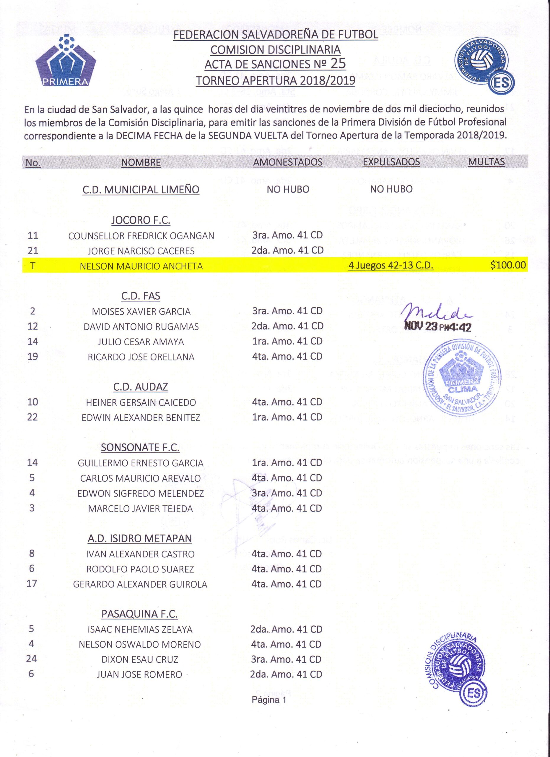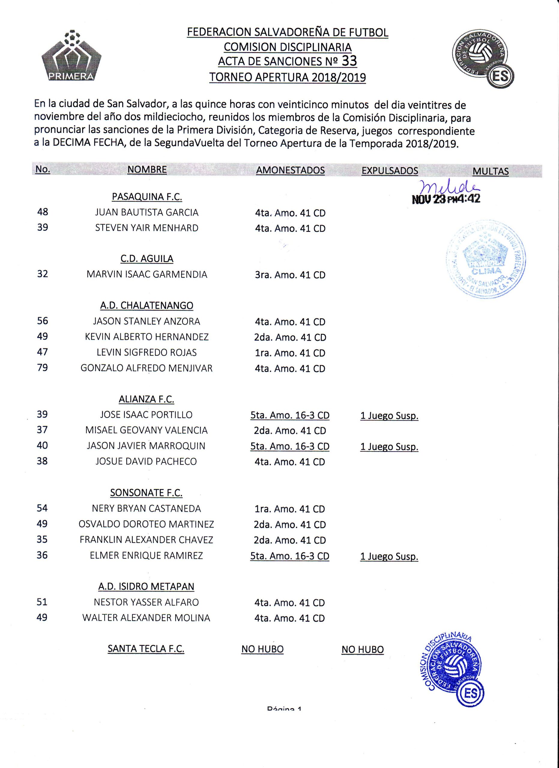 Tras una pausa por compromiso deportivos de Fecha Ficha se completó la penúltima fecha de la fase regular en Liga Pepsi Apertura 2018, este pasado jueves, y la Comisión Disciplinaria del ente federativo dio a conocer las actas de sanciones impuestas en dichos encuentros, tanto en Cat. Mayor como reservas.