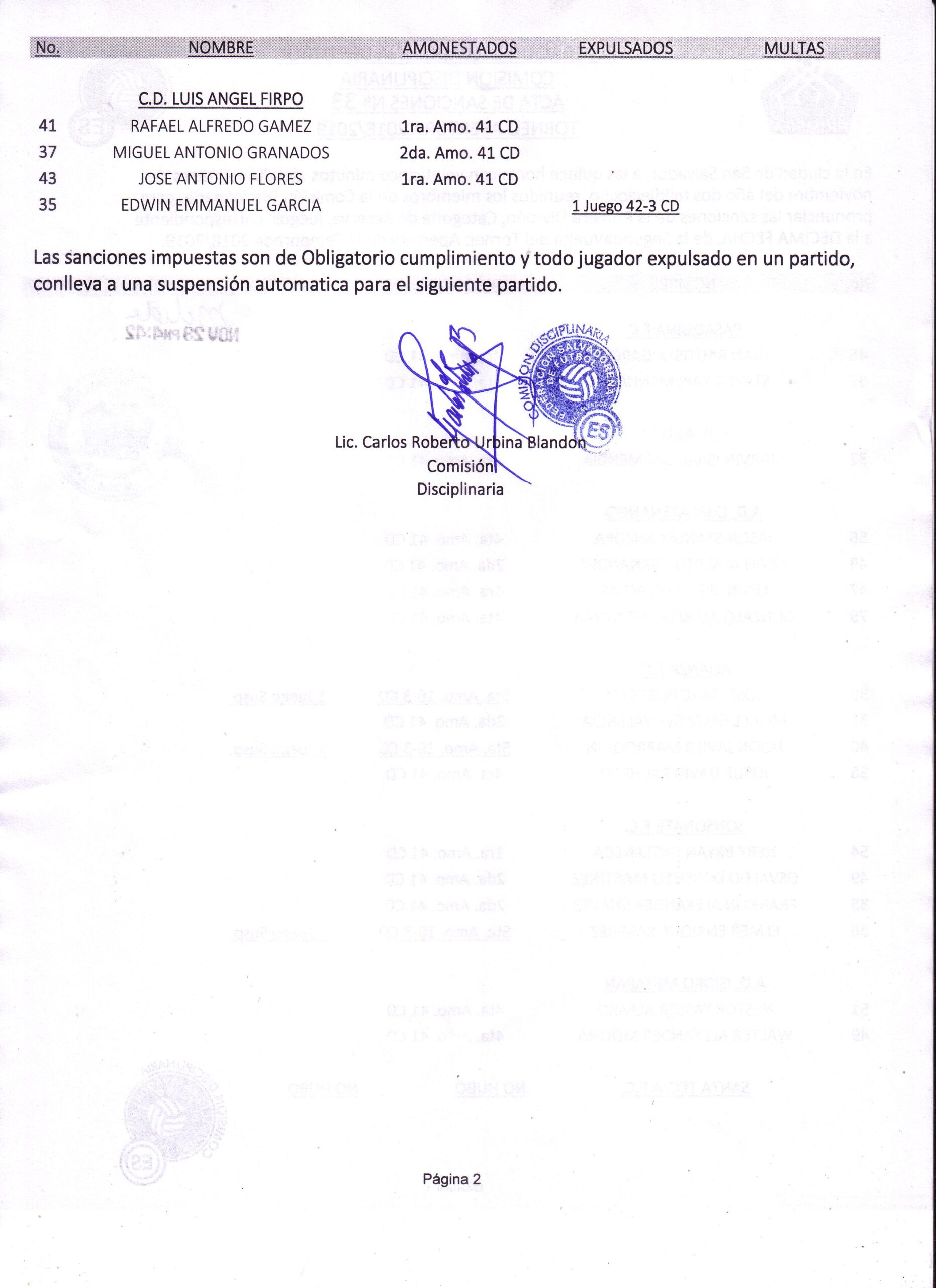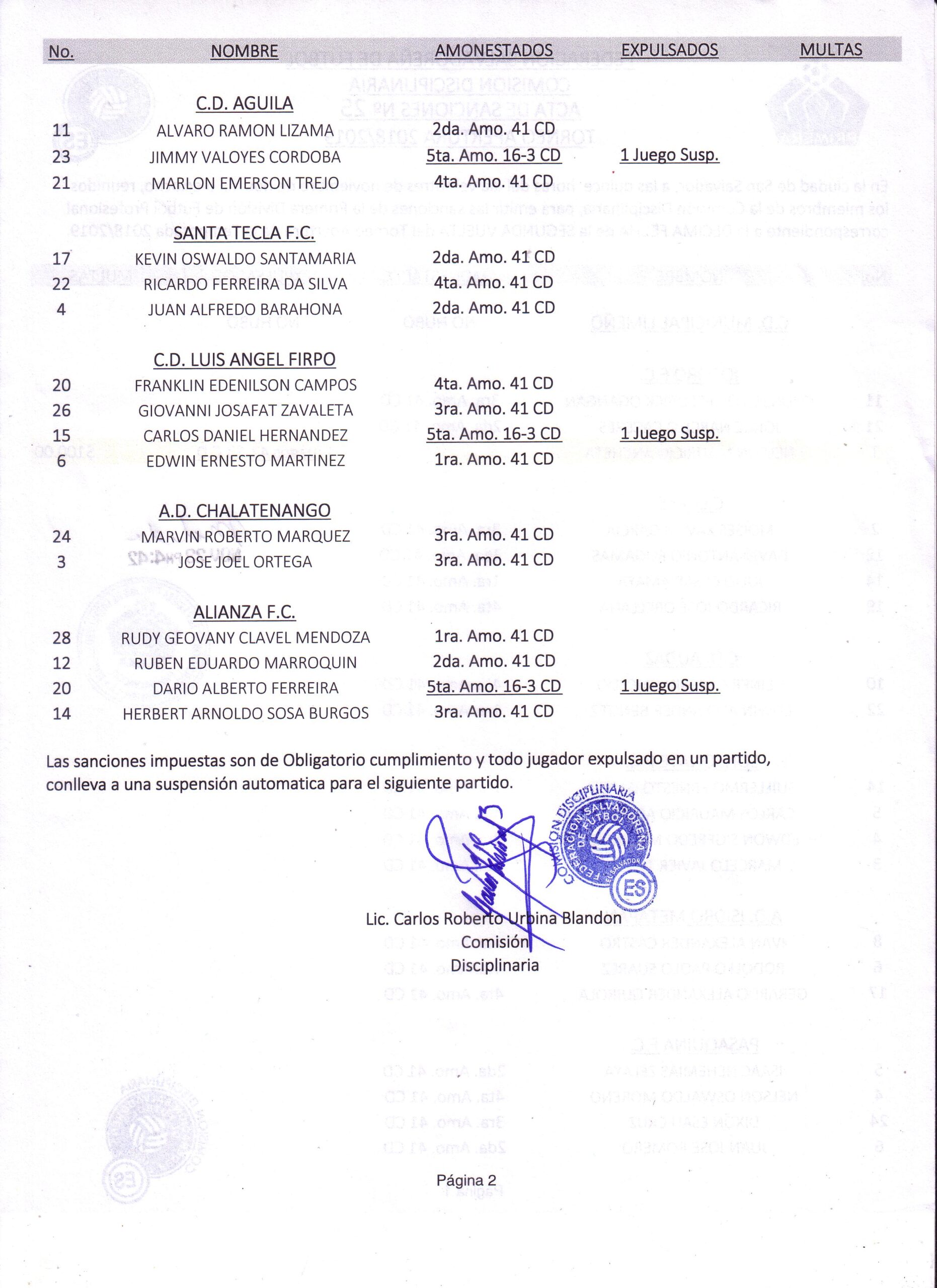 A continuación se detallan en los documentos oficiales, los jugadores amonestados y/o suspendidos (Incluye acta de juegos realizados en fin de semana):