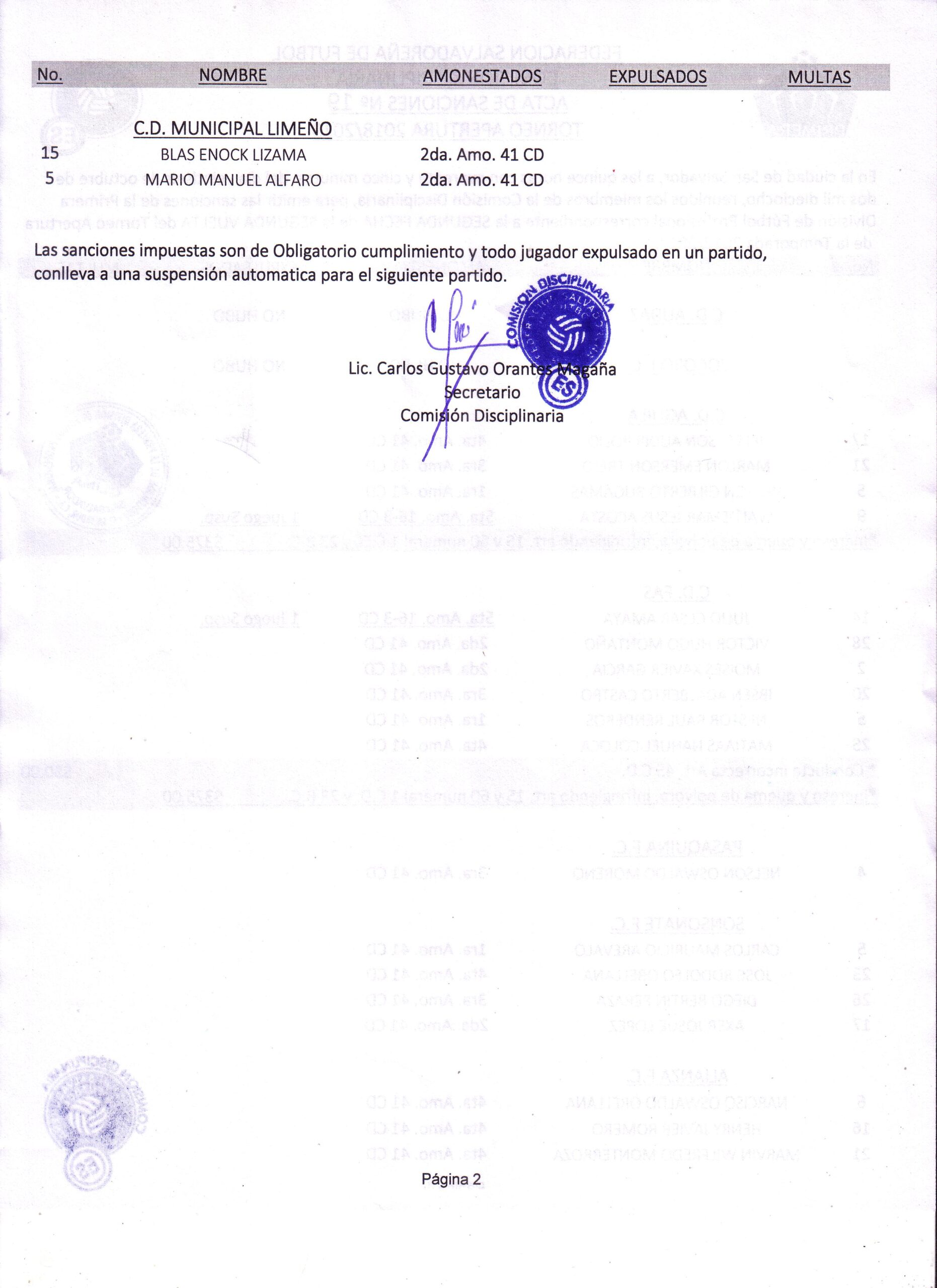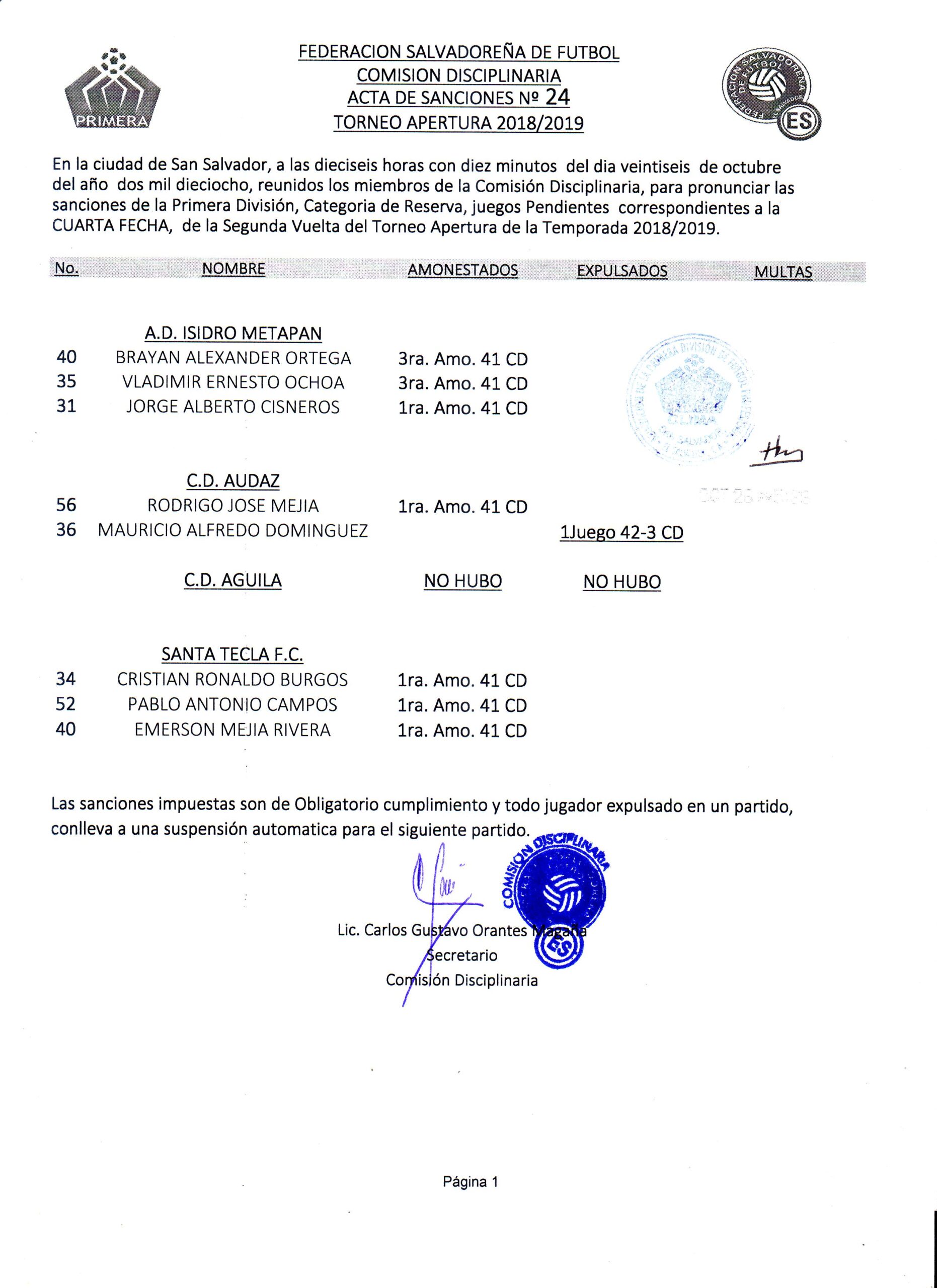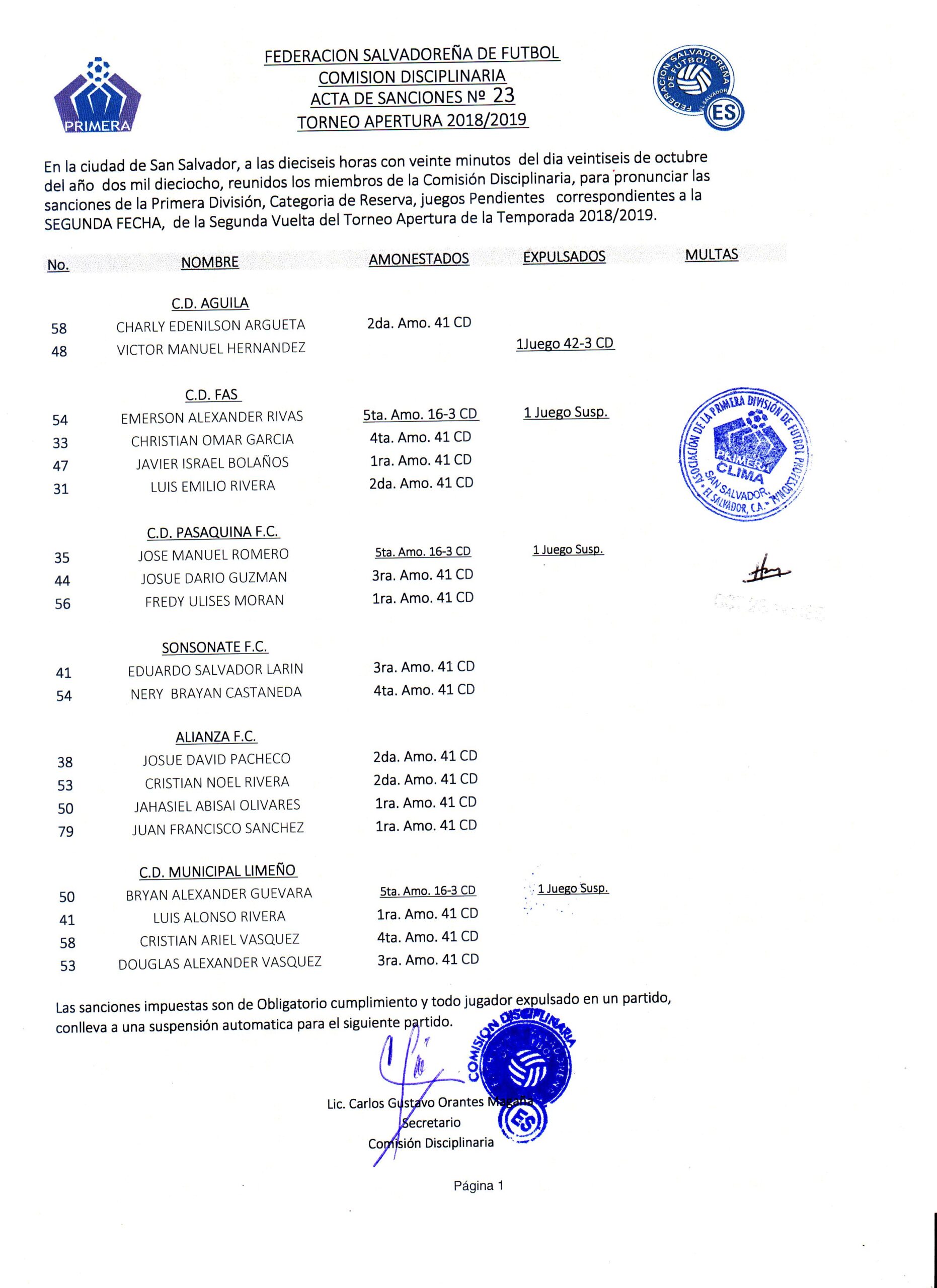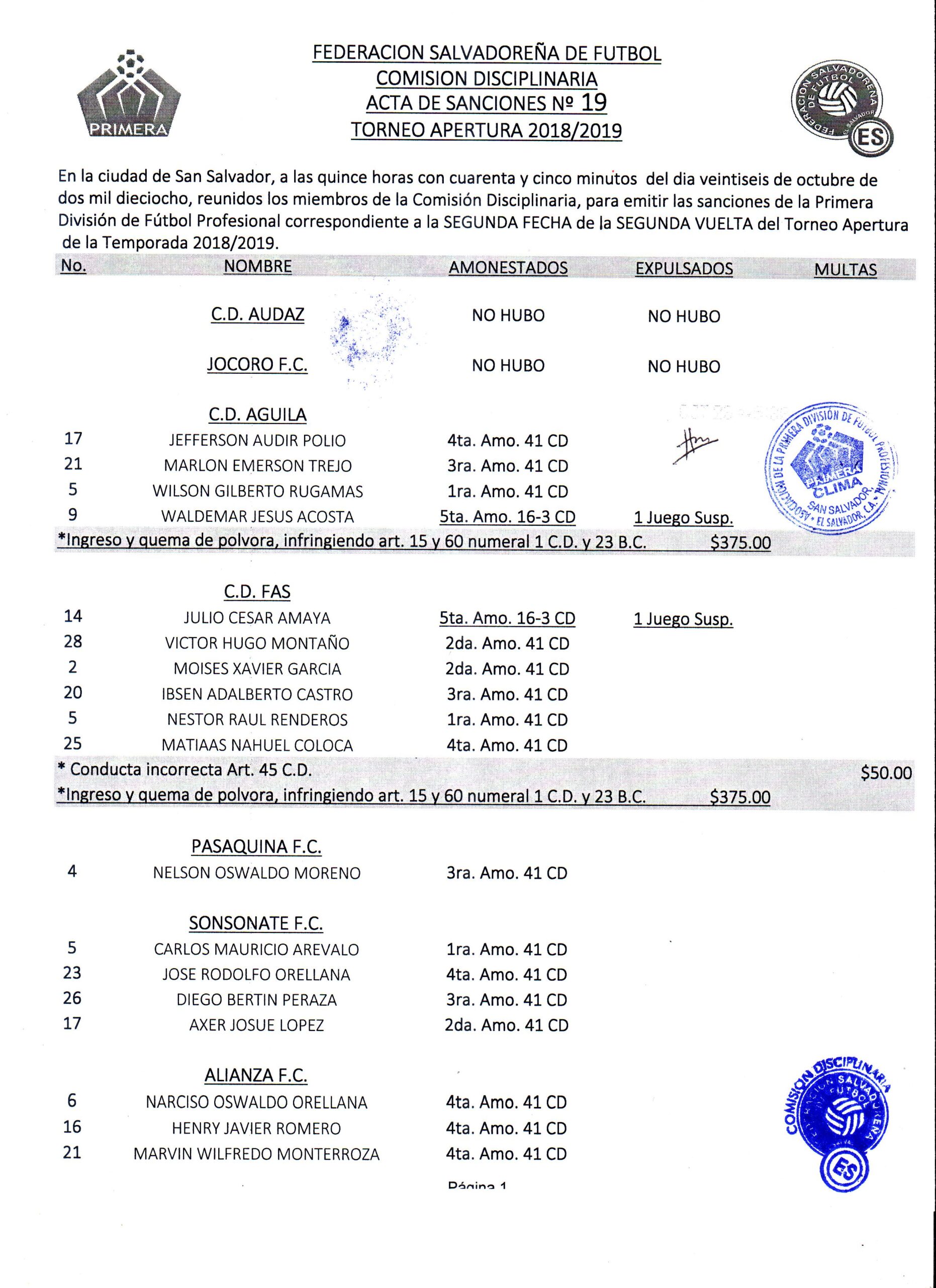 Esta pasado martes, miércoles y jueves de la presente semana, se llevaron a cabo juegos pendientes de las Jornada 13 y 15, los cuales fueron suspendidos debido a las condiciones climaticas que atravesa el país el 06 y 07 del mes en curso, tras la realización de los encuentros, La Comisión Disciplinaria de la Federación Salvadoreña de Fútbol dio a conocer las actas de sanciones correspondientes a dichos partidos, a continuación se detallan: